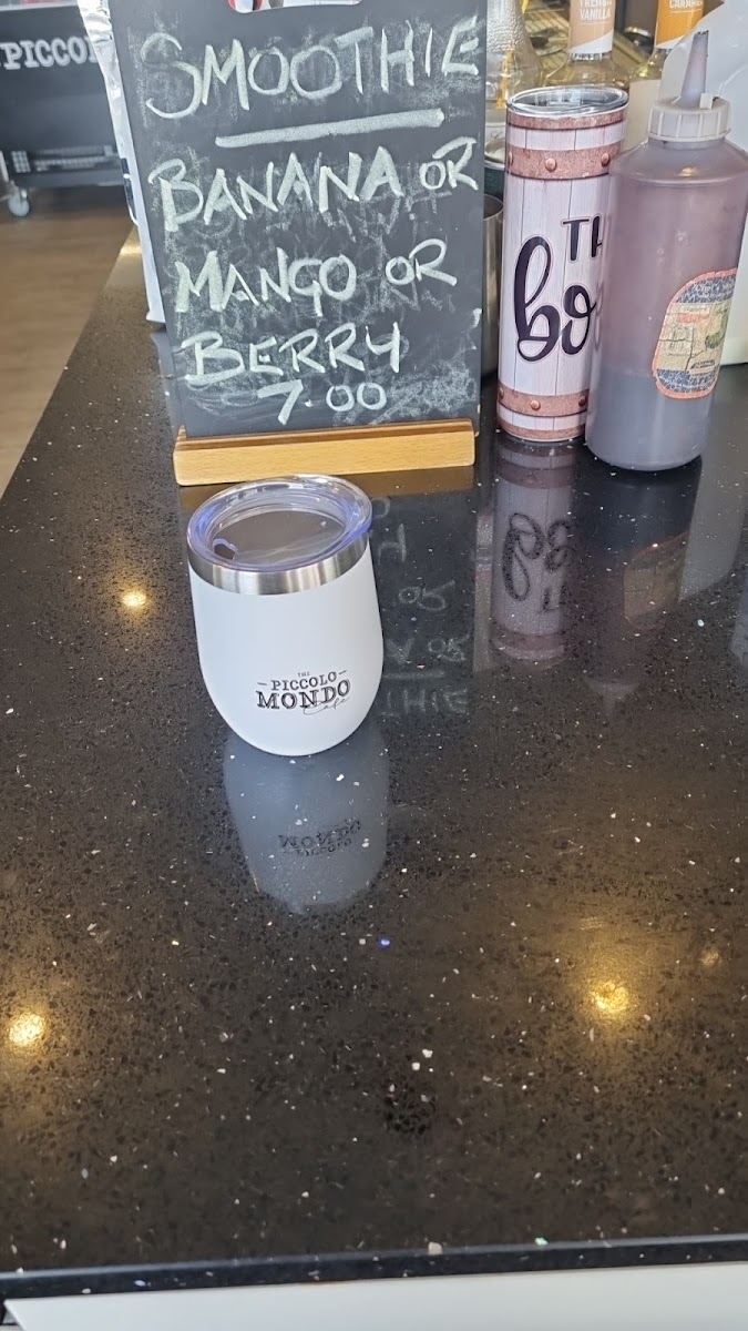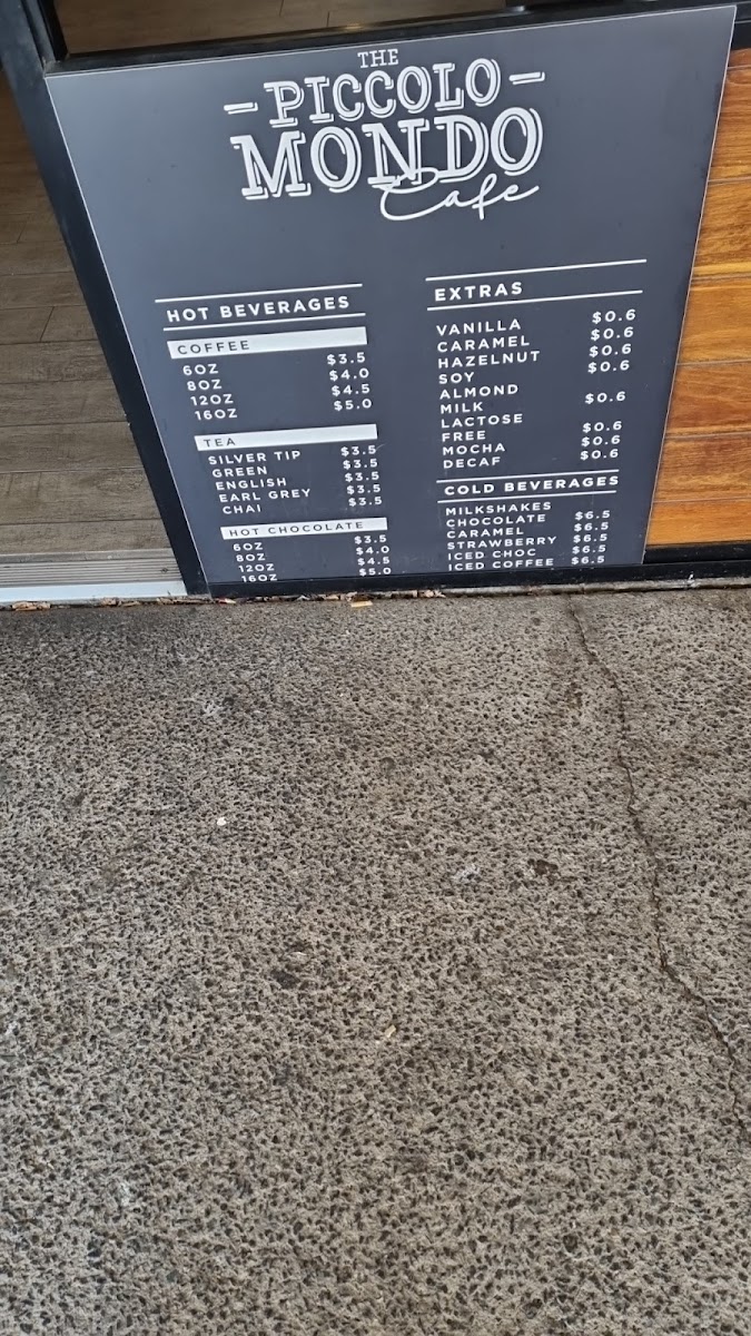 The moment you step inside, you're greeted by the warm aroma of freshly brewed coffee, which sets the tone for an exceptional experience. The Piccolo Mondo specializes in a variety of hot beverages, particularly their expertly crafted coffee, available in a blend of options including mocha, decaf, and a selection of milk types such as soy and almond. Each cup is a testament to skillful craftsmanship, eliciting praises from patrons like Sharon Kettle, who raved about their “high quality” coffee after years of disappointment abroad. For those who prefer iced options, their iced coffee and milkshakes like chocolate, caramel, and strawberry deliver refreshment with every sip.